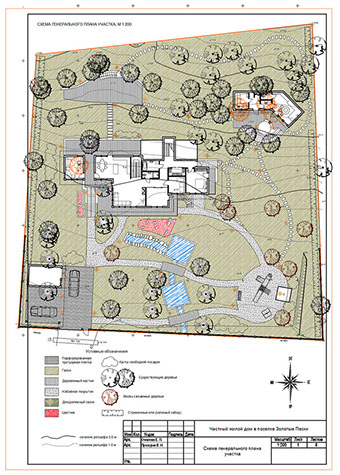 Architectural project involved a whole complex of concept ideas and working drawings for the house interiors and the site landscape plans. A small separate sleep-out with Russian bania and an outside hot water bath were set in the top right corner of the site.